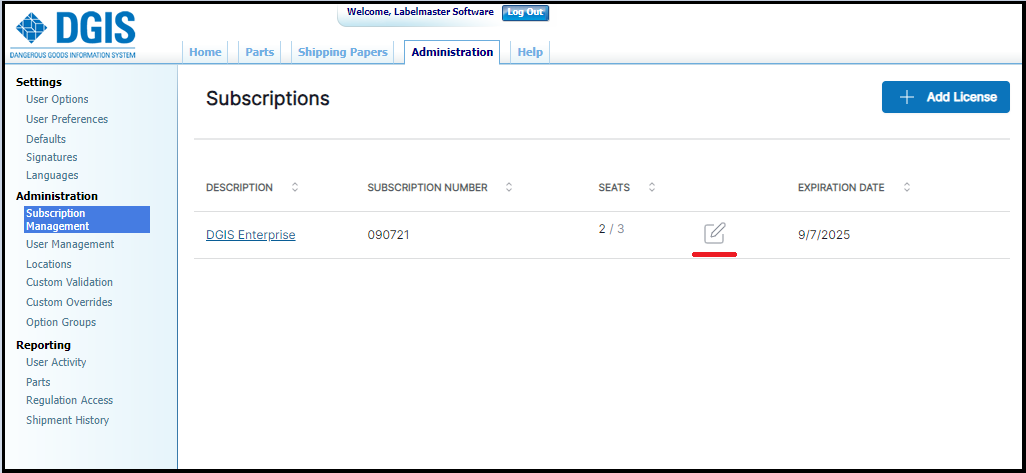 The Subscription Management screen will be visible to Administrators and Managers after clicking the Subscription Management link in the left-hand side view in the Administration tab.