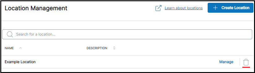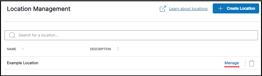 The Location Management screen will be visible to Administrators and Managers after clicking the Locations link in the left-hand side view in the Administration tab.