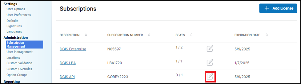 On the next screen, click the pencil icon for the DGIS API license and check off the username for the account that will manage the API Keys for the company and click Save.