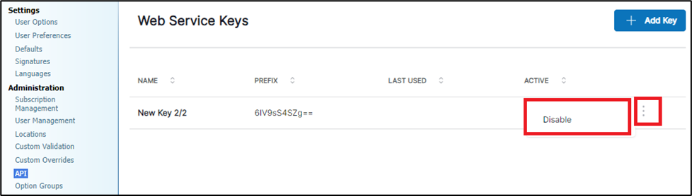 To create and manage API Keys, log in with the DGIS account that is set up with this right and click on API under the Administration tab. From here, you will see the name and prefixes for API Keys that were created within the API Key module. You can disable these keys by clicking the three dots and Disable. Keep in mind that once a key is disabled, it cannot be enabled again through the DGIS site.