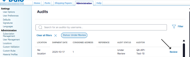 When the Auditor clicks Assign to Me they will see their DGIS username listed under the Auditor column and click the Review link to view Shipment details.